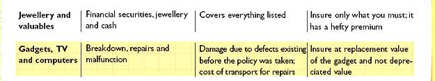 Section 6 covers your television, laptop and even cellular phone against all types of risks - be it fire and allied perils, theft, accidental breakdown. Even if you accidentally drop the idiot box while moving it from one room to another, you will get the claim if it was insured. Then there are sections that cover for plate glass, public liability, baggage and even bicycles. To make the package more comprehensive, insurers even tuck in personal accident cover.