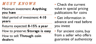 Investments in ancient coins have always yielded big returns, agree coins collectors, but it is not easy to trade in them due to government regulations. All coins over 100 years come under the Antiquities and Art Treasures Act and need a clearance from the Archaelogical Survey of India before being traded outside the country. Hence, the trade is limited within the country.