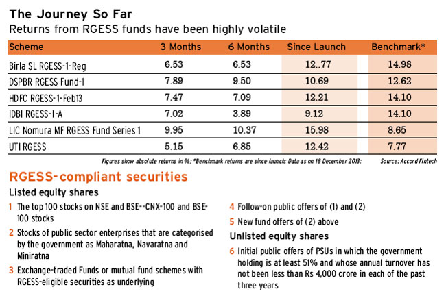 Another reason fund houses are not keen to launch new funds under the RGESS is that many existing schemes-Nifty and Sensex-based index funds-are RGESS-compliant. So, new investments can be channelled through these funds as well.
