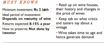 But investors who wish to lock some of their fortunes with that of their favourite wines ageing in oak barrels can do so by trading abroad. However, the entry price is high. “Anything between Rs 5 lakh and Rs 10 lakh is a good amount to start investing,” says sommelier Magandeep Singh.