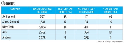 South-based companies (India Cement & Ramco Cement) saw 9.7% fall in sales. JK Cement reported 14% volume growth. Khattar says volumes of JK Cement, Shree Cement and UltraTech rose on account of capital expenditure and acquisitions. Drop in diesel prices reduced freight costs. Demand is expected to rise in 2015-16 and provide the companies pricing power. The top sector pick is UltraTech due to efficiency of operations and management quality. In the mid-cap space, the top pick is JK Lakshmi Cement, which has one of the most efficient operations and operates in east India, one of the most profitable regions.