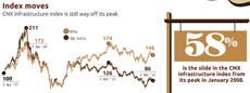 CNX infrastructure index, which comprises stocks of telecom, power, port, air, road, rail, shipping and utility companies, has slumped 58 per cent from its peak in January 2008. The Nifty has fallen 14 per cent in the period.