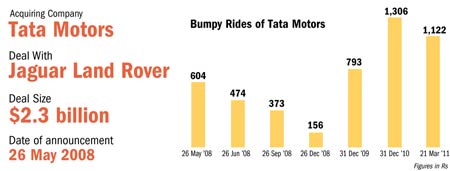 Samar Vijay, director, InvestCare says, "The initial reaction to Tata Motors' acquisition of JLR was negative, well reflected in its stock price. However, JLR alone would contribute approximately Rs 7,000 crore to the operating profit of Tata Motors for the financial year ended March 2011."