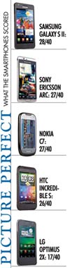 | Warriors SAMSUNG GALAXY SII (Price: Rs 30,000) 8MP; LED Flash: on, off, auto. Focus: Auto, macro, face detection; Scene mode: None, portrait, landscape, sports, sunset, night, party/indoor, beach/snow, dawn, fall colour, firework, text, candle light, backlight. Shot mode: single, smile, beauty, panorama, action, cartoon. Image Stabilisation; No dedicated camera key, 4.3-inch display. SAMSUNG GALAXY SII (Price: Rs 30,000) 8MP; LED Flash: on, off, auto. Focus: Auto, macro, face detection; Scene mode: None, portrait, landscape, sports, sunset, night, party/indoor, beach/snow, dawn, fall colour, firework, text, candle light, backlight. Shot mode: single, smile, beauty, panorama, action, cartoon. Image Stabilisation; No dedicated camera key, 4.3-inch display. LG OPTIMUS 2X (Price: Rs 25,499) 8MP; LED flash: on, off, auto, red eye reduction; Focus: auto, macro, face tracking, manual. Scene mode: auto, portrait, landscape, sports, sunset, night. Shot mode: continuous, out focusing, smile, art, beauty, panorama stitch. Image stabilisation; no dedicated camera key; 4-inch display. NOKIA C7 (Rs 17,999 ) 8MP; LED flash: on, off, auto, red eye reduction. Fixed focus; Scene mode: auto, manual, portrait, landscape, night; night portrait. Dedicated camera key; 3.5-inch display. HTC INCREDIBLE S (Rs 26,399) 8MP; Dual LED flash: on, off, auto. Focus: auto, face detection, touch; Auto enhance; No dedicated camera key; 4-inch display. |