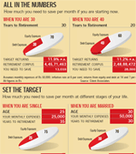 Says Viraj Ghatlia, Head, Financial Planning and Wealth Advisory, ASK Wealth Advisors: “At the very least, investors can start saving 10-15 years prior to retirement.” But the earlier you begin, the easier it is on your pocket, and the better your chances of riding out the ups and downs of the economy and the market. Time is the key to creating the targeted corpus. Says Hemant Rustagi, CEO, Wiseinvest Advisors: “Look at it another way, for every 10 years you delay before starting to save for retirement, you will need to save three times as much each month to catch up. Simply put, the sooner you begin saving, the better.”