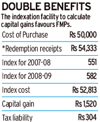 Indexation allows investors to get a better post-tax return. Comparative fixed income instruments like the bank fixed deposits don’t have a similar tax advantage like FMPs. As a result, the post-tax yield for an investor in the highest tax slab is merely 5.4 per cent per year on an 8 per cent bank deposit while a similar yielding 13-month FMP nets about 7.4 per cent post-tax.