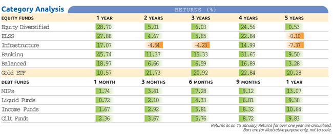 Banking sector funds outperformed other categories with average category return of 46 per cent during the year ended 15 January 2013 -Click here to Enlarge