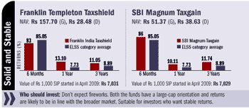 Slow and steady wins the race. Both Franklin Templeton Taxshield and SBI Magnum Taxgain have a decidedly large-cap orientation. While this means muted returns when the markets are rising, it also means a limited downside when the going gets tough. Franklin Taxshield fell less than the category in 2008, but has risen less than the average ELSS fund in 2009. In fact, both the funds have underperformed the category in the short term, but outperformed it over the longer term. Investors can expect returns in line with the broader market.