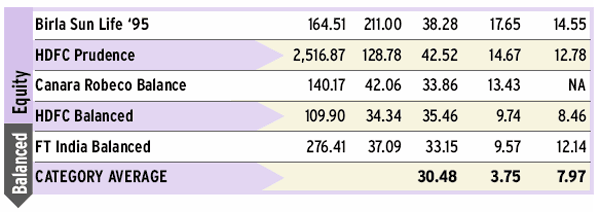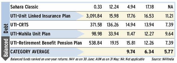 Both debt- and equity-oriented balanced funds have earned positive returns as opposed to equity diversified and tax planning funds, which have lost money in the past year. The relatively smaller fund, Sahara Classic, has almost matched the returns of the top performing equity balanced fund.
