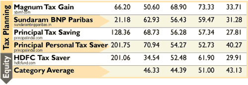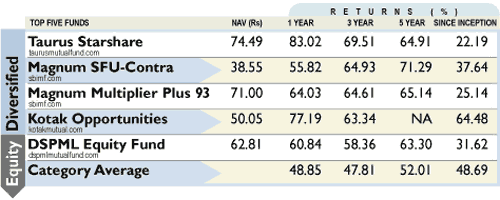 | | Magnum Tax Gain has been a consistent performer, beating the best performing fund in the equitydiversified fund category over the past five years. In the past one year, Taurus Starshare has given the highest return—almost twice what the Sensex earned. |