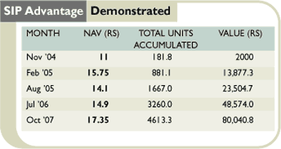 | | An SIP of Rs 2,000 over a three-year tenure (Rs 72,000) from November 2004 to October 2007 would have grown to Rs 87,062—a growth of 21%. |