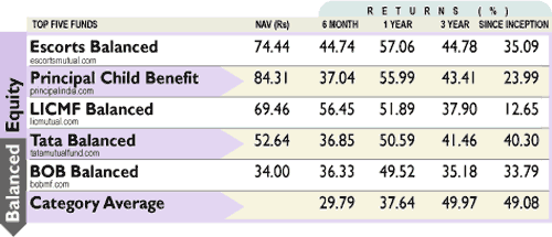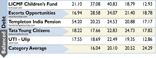 | | The top ranking equity-oriented balanced funds have fared well in the past one year, but the category average performance has been much lower as a whole. Top 5 funds are far too ahead of the rest. Debt is out of favour as indicated by the lower returns the schemes have earned. |