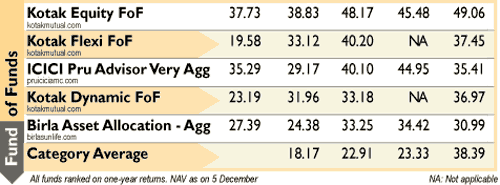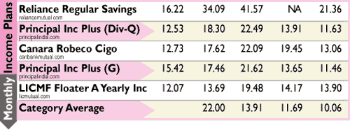 | | Kotak has three of its FoF in the Top 5, indicating the AMC’s ability to earn better through its existing funds. The returns in this category are based purely on the overall performance and spread of the fund house. Among MIPs, Reliance Regular Savings is way ahead in the category.The returns beat bank FDs hands down. |
