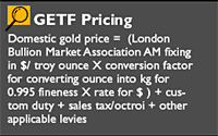 The GETF will use the London Bullion Market Association (LBMA’s) price in dollar per troy ounce (about 31.1 gm) as the base price (see GETF Pricing). The actual GETF price will be higher than LBMA due to customs duties at Rs 1,000 per kg and VAT at 1%. Gold prices across India are reported through a poll of bullion dealers who use similar pricing formulae. So GETF prices will correspond closely to the local spot price.