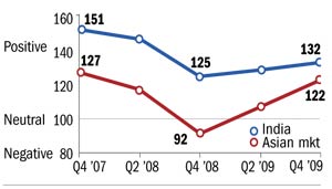 The fact that the Indian economy is inching its way to recovery has been endorsed by the third quarter results. This upbeat mood has also been corroborated by the small and medium-sized enterprises (SMEs) in a recent HSBC survey. According to the Small Business Confidence Monitor, which gauges the six-month outlook of SMEs across the world, India is positive about the first half of 2010. In fact, for the second consecutive time, India posted the second highest index score of 132, up from 128 in 2009. The top slot was bagged by Vietnam.