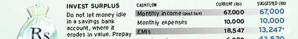 After subtracting these EMIs, SIPs of Rs 6,000 in the five funds and the average insurance premium of Rs 3,440 a month, Shukla's cash flow generates a handsome surplus of about Rs 22,000. What does he do with the money? "It is usually in my savings bank account," says Shukla, who is sitting on about Rs 2 lakh cash stacked away in his account.