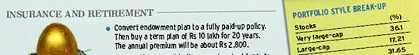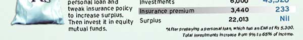 Another way to increase Shukla's monthly surplus is by converting his endowment plan to a fully paid-up policy. The plan is very expensive and provides a cover of Rs 8 lakh at an annual premium of about Rs 41,000. To compensate for the loss in cover, Shukla can buy a term plan of Rs 10 lakh for 20 years. The annual premium will be about Rs 2,800. These two moves, prepaying his personal loan and converting the endowment plan to a fully paidup policy, will add Rs 8,740 to his surplus. As recommended earlier, he should invest this sum in equity mutual funds.