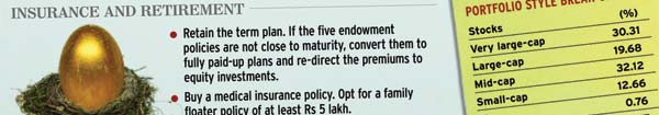 Srivastava has got his insurance plan right. He has bought a term plan of Rs 45 lakh, which costs Rs 19,000 a year. He has padded it up with five endowment policies that offer a collective cover of Rs 12 lakh. These were bought in the early 1990s, so he can surrender or convert them to fully paid-up plans, unless they are close to maturity.