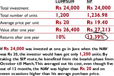 Equity markets are inherently volatile. They move up and down due to a combination of several factors (government policies, corporate profits, global markets, interest rates). Investors who put in a lumpsum are often caught on the wrong foot if markets dip. SIPs help investors tide over the volatility by averaging out the cost as shown in the example.