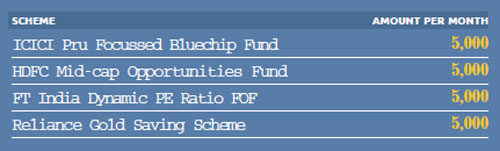 Q. I am 28 years old and have systematic investment plans (SIPs) in DSP BlackRock Top 100 Equity Growth (Rs 1,000 since December 2010), Franklin India Bluechip Growth (Rs 1,000 since January 2011) and IDFC Premier Equity Growth (Rs 2,000 since January 2012). I also have been putting Rs 5,000 in National Pension System (NPS) since April 2011. I want to plan for my retirement at about 60 years. My monthly expenses are about Rs 30,000 in today's value. I have up to Rs 2 lakh in bank fixed deposits (FDs). I can invest another Rs 10,000 per month. I have two life plans maturing in 2039. What would be my best options? -Priyank Mathur, MumbaiA. Your existing portfolio is sufficiently diversified for now. But, we would recommend you add debt mutual fund schemes or bonds. You can also consider adding a gold scheme (inverse correlation with equities) to limit the number of mutual funds. It is also recommended you include one balanced mutual fund scheme. This will help mitigate risks.