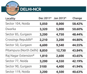 (All rates are average prices in Rs per sq ft; * average price during Oct-Dec 2011; ^data as on 31 Jan 2013; #Ghaziabad)
