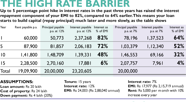 Interest rates have climbed by 5 percentage points, raising the entry barrier for home buyers. Every 1 percentage point increase in home loan rates raises the annual payment on a Rs 20 lakh loan for 15 years by Rs 14,000. Getting a loan is also a tad more difficult. Till recently willing to fund up to 90% of the house prices, banks are reluctant to fund more than 80%. Also, with every percentage point rise in the home loan interest rate, for the same salary, your eligibility goes down by Rs 1 lakh. Most importantly, property prices are not going to rise as fast as they have in the past five years. This not only reduces the lure of real estate as an investment option, but gives the first time home buyers some time to plan their purchase rather than rushing into one for fear of paying a much higher price later.