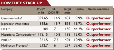 Madhucon Projects (MPL): With its focus on road, irrigation and real estate sectors, the company earns superior margins vis-a-vis peers owing to its prudent policy of using own equipment and limited subcontracting. A strong order backlog of Rs 4,380 crore, along with stable margins, would likely drive a 39% CAGR in MPL’s earnings over 2006-9. At six times 2008-9 earnings, MPL trades at a steep 25-30% discount to peers despite the sharp earnings growth and value-accretive ongoing BOT projects. Reiterate outperformer.