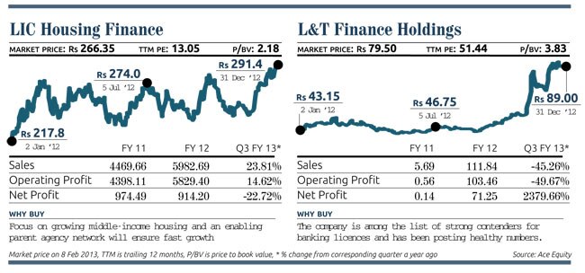 Stocks of NBFCs that are expected to apply for bank licences rose in the last quarter of 2012 after Parliament passed the banking Bill. These were L&T Finance Holdings (84 per cent to Rs 89) Mahindra & Mahindra Financial Services Ltd (23 per cent to Rs 1,104), Shriram City Union Finance (28 per cent to Rs 98.65) and Reliance Capital (11.27 per cent to Rs 479.8).