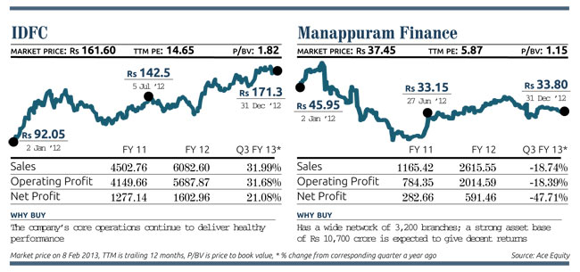 The company has gold loan assets of Rs 10,700 crore. According to an Ambit Capital Capital report, the restrictions on opening branches is not negative for the company, as it already has 3,200 branches, which are sufficient for 20 per cent a year growth for the next three-four years. In 2012, the stock fell 26 per cent from Rs 46 to Rs 33. However, experts are bullish for 2013. An Edelweiss Securities report says the stock can touch Rs 48 and return 21.3 per cent in 2012-13 and 20.4 per cent in 2013-14.