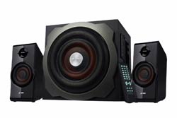 This is a surround, sound device with 5000W PMPO that has two speakers and delivers powerful sound. The sub-woofer comes with a 6.5 inch full-range driver. The satellite speakers are powered by 3-inch full range drivers for high performance sound quality. The A530U has smooth connectivity with MP3 players, PC, TV, CD and DVD players. It comes with a built-in digital FM player.