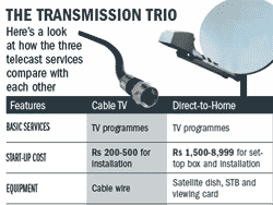 The IPTV system also uses an STB, but you receive the transmission through a cable that provides three services—TV, Internet and landline. A splitter divides the cable between your phone and modem. The modem, in turn, splits the line into two—for the broadband connection and TV. So far, the IPTV service is provided by Airtel digital TV interactive and MyWay.