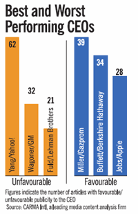 The Fab Five The top five CEOs on our list (some of them have quit their jobs during the survey period) have not always been in the limelight for the right reasons. ![]() Warren Buffett Buffett was commended for his leadership, as also for Berkshire Hathaway’s corporate dealings, namely bailouts for Swiss RE, or the offer to help Goldman Sachs. ![]() Rick Wagoner Wagoner received a lot of negative publicity due to GM’s financial problems and had to quit in March 2009 under pressure from the Obama administration. ![]() Vikram Pandit Pandit considered a “superstar” over the summer of 2008, Pandit has somewhat fallen from grace. His competence was questioned as Citigroup’s problems escalated. ![]() Steve Ballmer Microsoft’s long-running hostile bid for Yahoo! through 2008 helped Ballmer stay in media glare with 591 mentions in tracked publications. ![]() Jerry Yang The failed Microsoft bid also ensured Yang, one of the world’s richest businessmen, received continuous media coverage through 2008. |