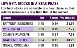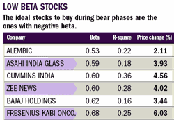 Investors should maintain an optimal ratio of low and high beta stocks in their portfolios. Stocks with a beta value of 0-1 are called low beta or less volatile stocks, whereas stocks with a beta value greater than one are called high beta or more volatile stocks. High beta stocks are suitable for aggressive investors, while conservative investors should go for low beta stocks. In a bull phase, high beta stocks can deliver high returns, but during a bear phase low beta stocks are more useful as their relative movement is less than that of the market. Though the ideal stocks to buy during bear phases are the ones with negative beta, such stocks are few in number (see tables above).