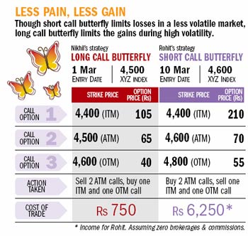 Consider an example. On March 1, Nikhil thinks the market may show limited volatility and uses the long call butterfly. The XYZ Index is trading at 4,500. Call options at strike prices of Rs 4,400, Rs 4,500 and Rs 4,600 are available at Rs 105, Rs 65 and Rs 40, respectively. Ten days later, Rohit thinks the market will be highly volatile and uses the short call butterfly. On March 10, the XYZ Index is trading at 4,600. Call options at strike prices of Rs 4,400, Rs 4,600 and Rs 4,800 are available at Rs 210, Rs 70 and Rs 55, respectively. The market lot is 50 contracts and we assume zero brokerage and commissions.