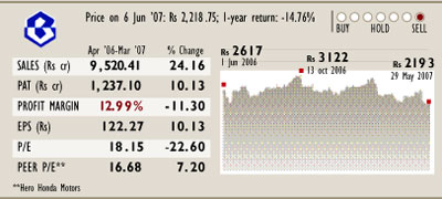 “Bajaj Auto’s Q4, 2006-7 performance has been above expectations both at the top line and bottom line. Net sales for Q4, 2006-7 grew by 6.8% YoY to Rs 2,314 crore while for 2006-7 it grew by 24.2% to Rs 9,520 crore.