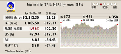 For the full year however margins were subdued at $3.6 a barrel although they were higher than $2 a barrel in 2005-6. The divergence in revenue and PAT was mainly due to skewed allocation of bonds in Q4, 2005-6.