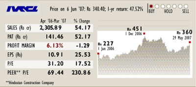 We have upgraded our earnings estimates for 2007-8 and 2008-9 by 8.8% and 6.6% respectively on the back of higher than estimated revenues and margins during the quarter. We have assumed a tax rate of 34% for 2007-8 and 2008-9 as we believe IVRCL will not be eligible for 80IA benefits. The stock is currently trading at 12.1 times 2007-8 earnings and 9.9 times 2008-9 earnings. We maintain ‘Outperformer’ with a price target of Rs 424 a share.”