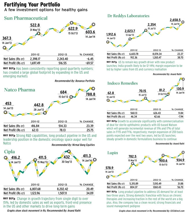Rakesh Goyal, senior vice president, Bonanza Portfolio, says that the expanding global footprint of Indian pharma companies will help them in the long run. "Pharma companies are expanding presence worldwide through new launches in generics markets, which is bringing them healthy margins. As US markets show signs of revival, investors are becoming more optimistic that the companies will be more profitable in the coming quarters," he says.