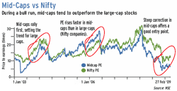 This resulted in a greater expansion of mid-cap PE (valuations) than the Nifty. “Over a period of time, the probability of creating more wealth is higher in mid-cap stocks, but these stocks are like a double-edged sword. During good times they outperform by a mile, but during downturns they under-perform by a wide margin. For an investor in mid-caps, two attributes are vital: stock selection and patience,” says Mehul Shah, assistant vice-president, Sharekhan.