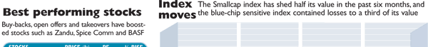 The Smallcap index has shed half its value in the past six months, and the blue-chip sensitive index contained losses to a third of its value.