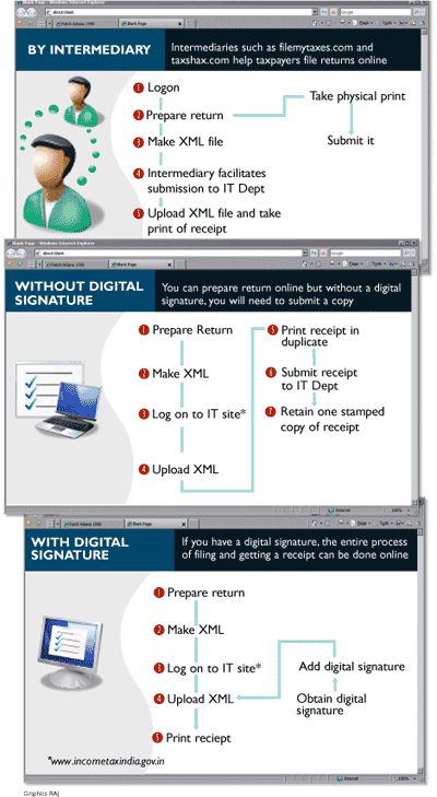 There’s no need to fret even though you do not have a digital signature. You can still use the Internet to file your return. Just submit all your details online. The computer will then generate an acknowledgement form (ITR-V). You have to take two prints of this acknowledgement form and submit them at the income tax office. The receiving official will return one stamped copy to you, which will be your evidence of having filed your return.