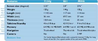 7130g is Blackberry's smallest device yet, and beats the other two phones in ease to carry. Sure the 14mm-thick E61 is the slimmest, but it cheats a little by being extra wide and long.The P990i has the bulkiest feel, but its touch screen puts it ahead in the race for ease of use for those who use stylus with as much ease as they use chopsticks when they eat Chinese food. Plus, like its predecessor= P910, it has two keypads in one phone.