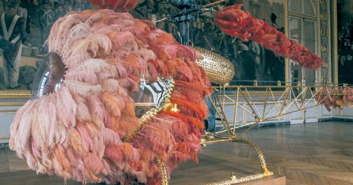 Vasconcelos is the first woman and the youngest artist to exhibit her work at Versailles. Her installations include Royal Valkyrie, a handmade woolen crochet work; Gardes, made with Port Laurent marble; Lilicoptere, a Bell 47 helicopter with ostrich feathers; Marilyn, made using stainless steel pans; Pavillon , made with wrought iron and Blue Champagne, a soaring structure made with Pommery POP Champagne bottles. Fascinating, audacious and beautiful all at once, the exhibit adds an element of theatre through still life. A must visit for all.