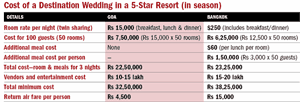 So where should you take your wedding party? Aditya Motwani, the wedding section head at Percept D’ Mark, says that a destination outside the country sometimes works out cheaper than a destination within. For instance, a threeday wedding celebration in Goa with 100 guests costs a minimum of Rs 35 lakh, including hotel accommodation, meals, vendor payments and entertainment. At the Marriott Phuket, a hotel room, if booked as part of a wedding package, costs Rs 6,500 per night, which is nearly Rs 4,000 cheaper than a 5-star hotel accommodation in Goa or Mumbai. However, the air fare could level the cost. As a typical destination wedding is designed for a much smaller group of guests, you can safely cross out the expense of food and stay for the great Indian extended family.