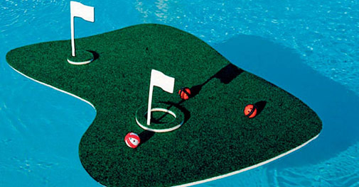 You need a 3 x 5 ft floating laminate of artificial turf with Velcro fasteners and twelve floating wiffle practice balls, also layered with Velcro strips. It makes for a three-hole game between two people, with the players taking a dive to dig out the ball each time.