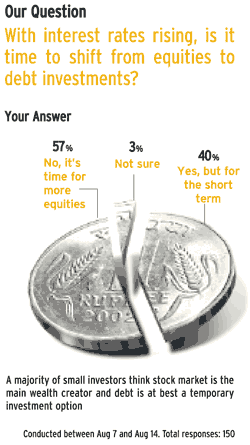 Your verdict ![]() Our question A majority of small investors think stock market is the main wealth creator and debt is at best a temporary investment option Conducted between Aug 7 and Aug 14. Total responses: 150 |