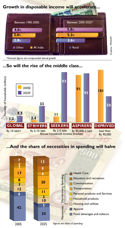 MGI’s study shows by 2025, over 2.3 crore Indians will be among the country’s wealthiest citizens. India’s growth will power income levels. The average real household disposable income will touch Rs 3,18,896 (in 2025) from Rs 1,13,744 in 2005—a CAGR of 5.3%.