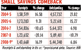 According to the provisional data released by RBI, the total receipts rose in 2008-9 after falling for two successive years. The scheme that’s gained the most is the bellweather post bank deposit. Another favourite is the monthly income scheme. Most investors link it to a savings bank, which is linked to a recurring deposit. Among the dozen small savings schemes, the post office savings bank deposits, post office recurring deposits, the monthly income scheme, Public Provident Fund and Kisan Vikas Patras have seen a rise in inflows.