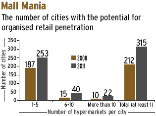 The study, Reinventing India’s Retail Sector, points out that 212 towns boasted sufficient market potential for hypermarkets in 2008. Says Sajjan Jindal, president, Assocham, “Given the expected growth in the number of households as well as in the income and consumption per household in urban India, five or more hypermarkets per city are feasible even in 2009.” By 2011, this number is anticipated to grow to 52 as a few tier III towns also gain the market potential to support five or more hypermarkets.