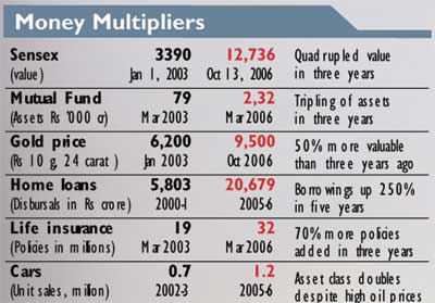 That’s about assets that mostly appreciate with time. Indian are also gathering depreciating assets at an appreciating pace. Car sales have zoomed the fastest in the past three years—not dampened by the highest ever rise in fuel prices. Over two lakh mobile handsets were sold every day in September 2006. The growth of high net worth population in India was the second fastest in the world in 2005, the latest World Wealth Report of Merill Lynch and Capgemini reported recently.